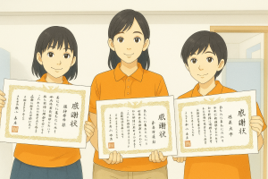 介護職として永年ご勤務されているの感謝状授与の条件で、推薦させて頂いた3名の方は10年以上介護のお仕事に携わってご利用者様の生活を支えて下さった方たちです。